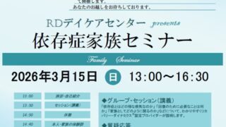 セミナー 【募集開始】依存症家族セミナー 2026年3月15日(日) 第4回 依存症家族セミナー開催4回目となるご家族を対象としたセミナーを3月15日(日)に開催いたします。長期に渡り依存症者の問題行動に振り回されてきたご家族は、孤立し、心身共に困惑・疲弊し、的確な判断や対応も難しくなってしまいます。本セミナ... 2026.02.03 セミナー広報