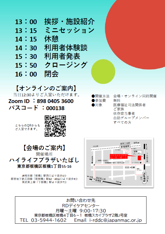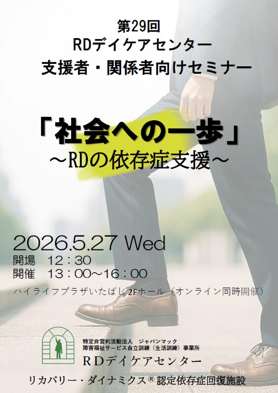 今回は「社会への一歩~RDの依存症支援~」をテーマに、認定プロバイダースタッフによる講義形式のセッション、RDメンバーの体験談、RDメンバーによる発表、施設紹介等を予定しております。