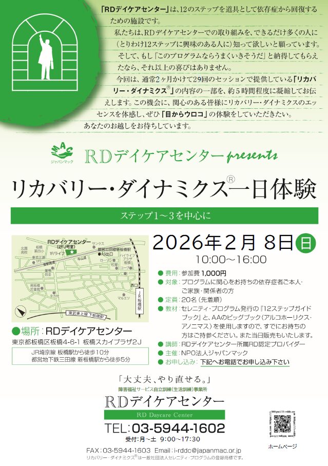 私たちは、RDデイケアセンターの取り組みを、できるだけ多くの人に(とりわけ12ステップに興味のある人に)知ってほしいと願っています。